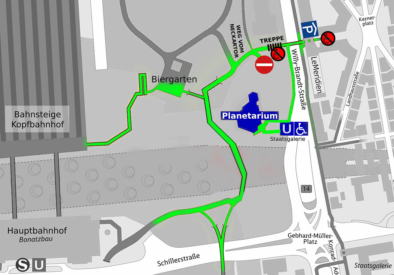 die Wege entlang von Stegen über die Baustelle möglich. Auch aus dem Mittleren Schlossgarten führt ein Rad- und Fußweg entlang des Innenministeriums zum Planetarium.